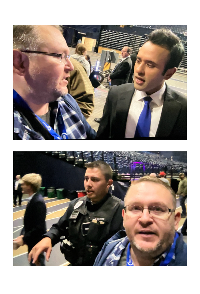 I didn’t drive nearly 3hrs to go home empty handed. After the event, I was denied access to the area where Ramaswamy went. I then snuck around and found him. I asked him one question before a handler stopped me. I tired to then ask Governor Gianforte a question but the handler demanded I leave. He called over an officer who made me leave keeping his hand on my back the entire time I exited.